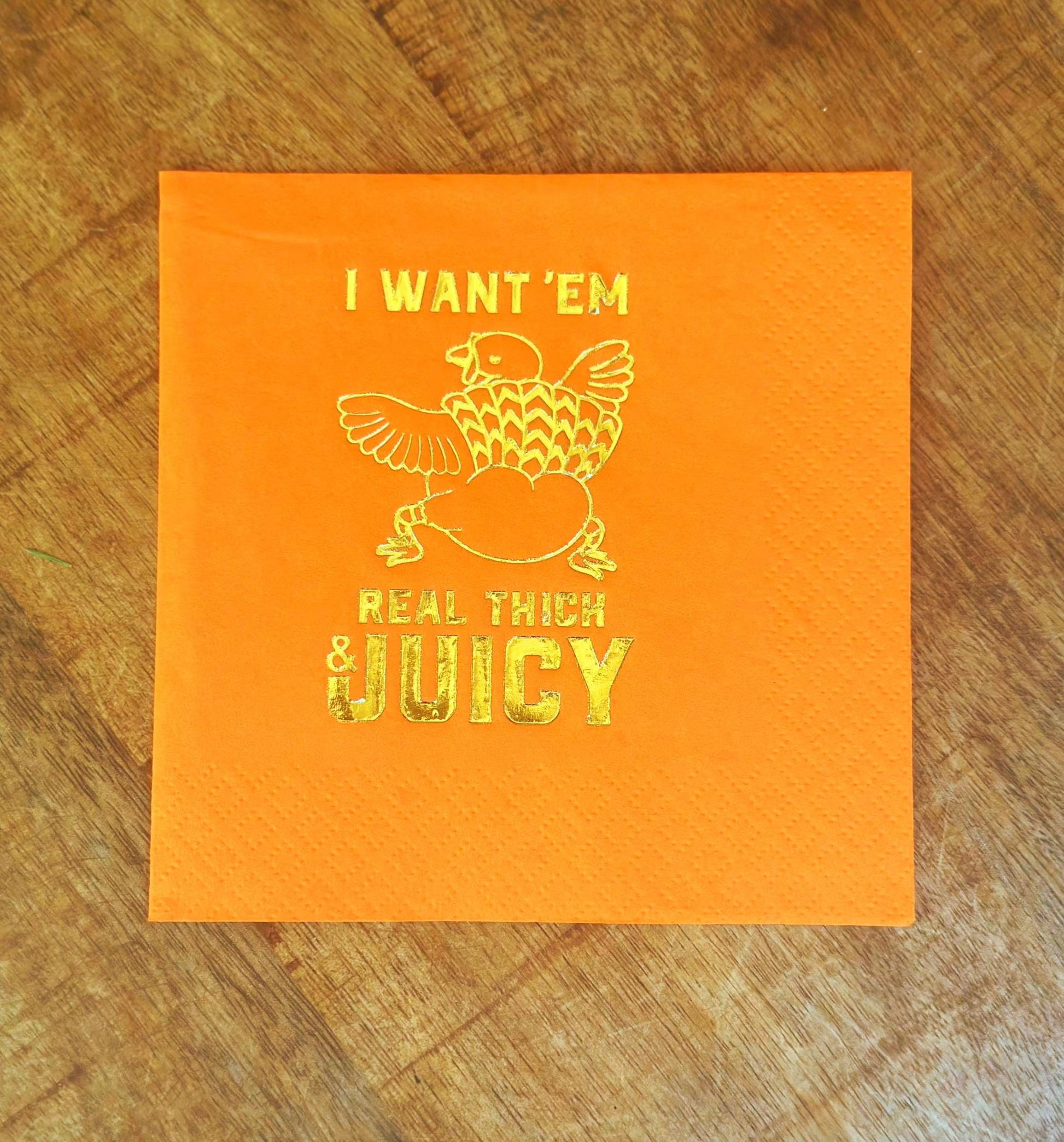 Add humor and style to your Thanksgiving or Friendsgiving celebration with these hilarious Funny Thanksgiving Cocktail Napkins. This set of 20 high-quality, foil-stamped napkins features four playful designs—Leg Day, Gobble Me Swallow Me, DTF (Down To Feast), and I Want 'Em Real Thick and Juicy—each in vibrant colors accented with elegant gold foil. Perfect for casual gatherings, these festive napkins are both functional and fun, making your table setting stand out.