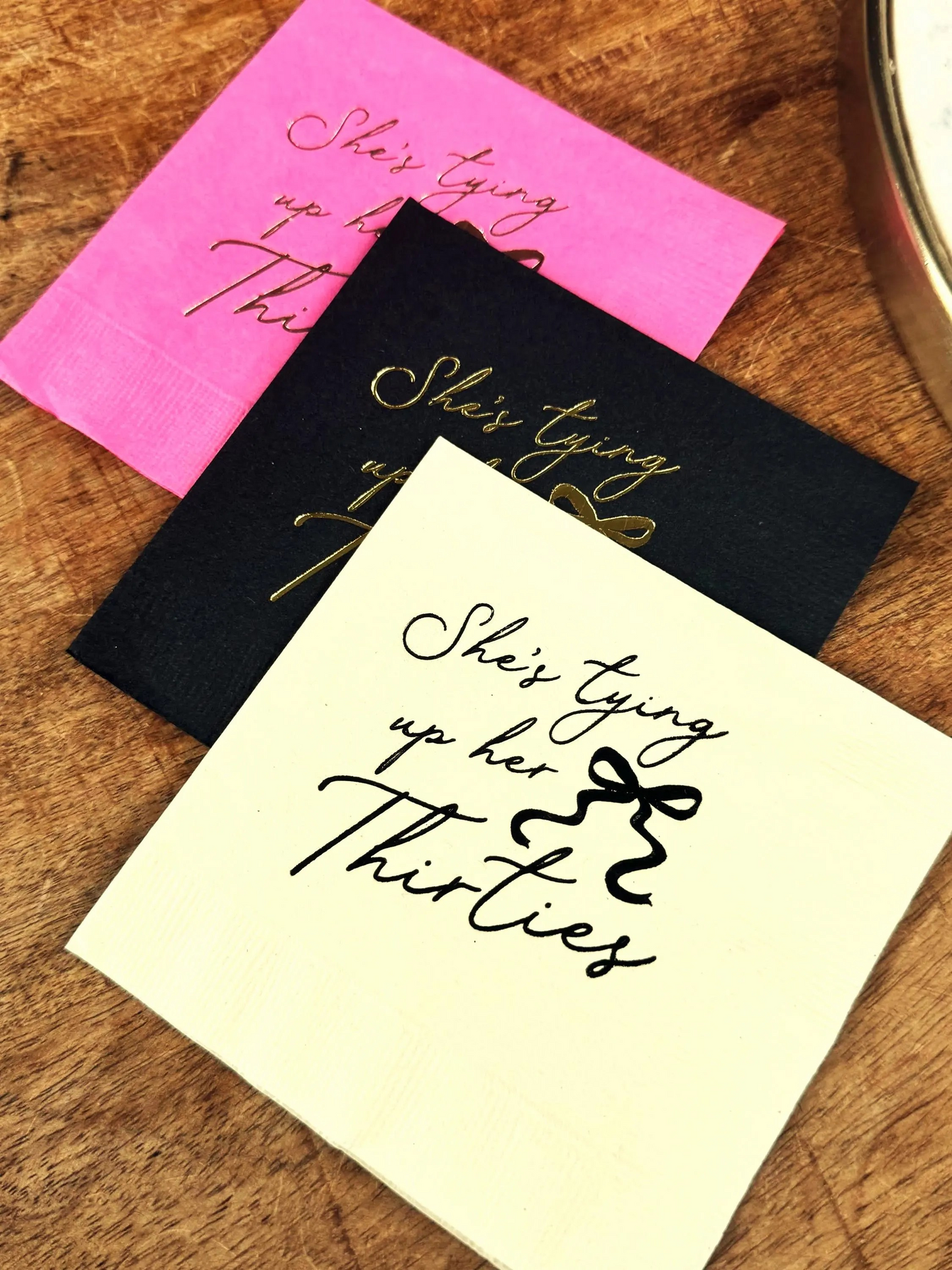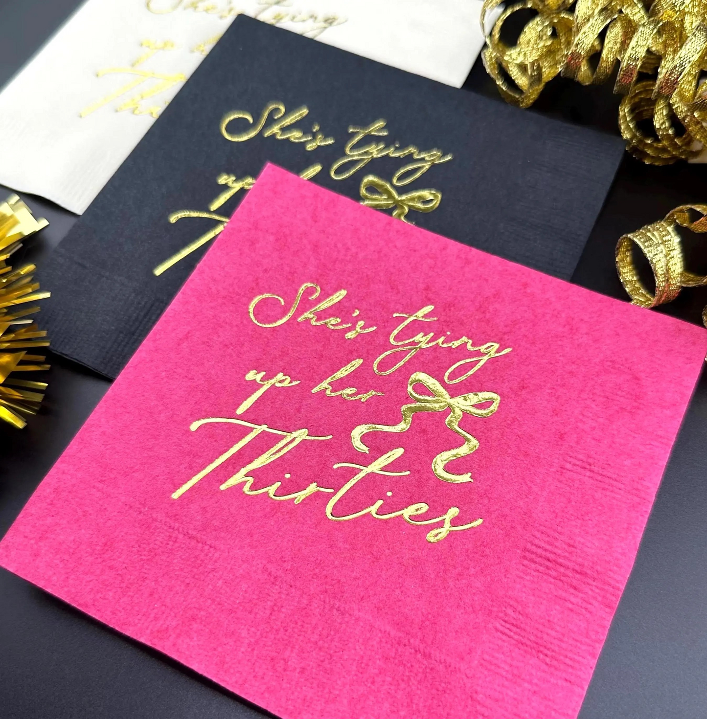 She’s Tying Up Her Thirties Cocktail Napkins with Whimsical Bow- Perfect for a 40th Birthday